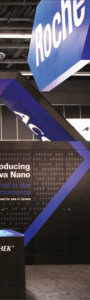 Des formes géométriques empruntées au logo iconique structurent le stand en s’appuyant sur la force de la marque Roche.